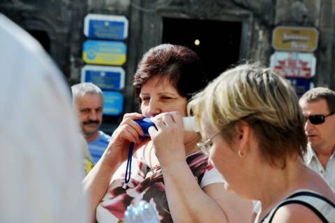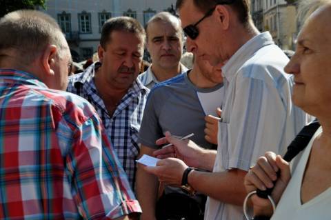 За 5 хвилин після початку акції, ледве не кожен учасник мітингу по-черзі підходить до чоловіка ззаду натовпу.