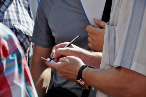 У нього ручка і папірчик. Учасники відмічаються. З якою метою? Можна лише здогадуватись.
