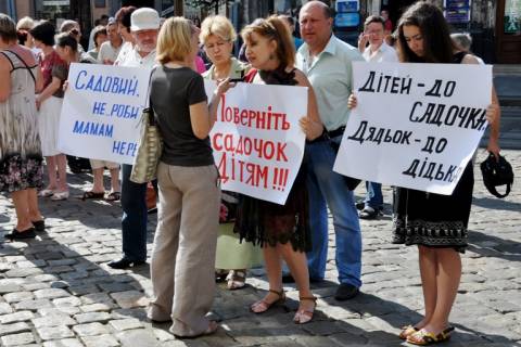 Здавалось би ніби всі повинні бути разом. Але ні, матусі, що прагнуть відвоювати дитсадочок на Сахарова – стоять окремо.