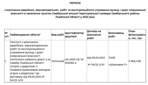 - затвердити Перелік з виконання аварійних, відновлювальних робіт та експлуатаційного утримання вулиць і доріг комунальної власності в населених пунктах Самбірської міської територіальної громади Самбірського району Львівської області у 2022 році" – йдеться у розпорядженні.