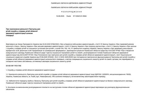 "З метою покращення соціального захисту дітей та сімей з дітьми, які перебувають у складних життєвих обставинах, оптимізації закладів соціального захисту дітей зобов'язую Службу у справах дітей обласної державної адміністрації припинити діяльність Притулку для дітей служби у справах дітей обласної державної адміністрації шляхом ліквідації" – йдеться у розпорядженні.