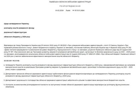 "З метою забезпечення ефективного використання коштів обласного бюджету зобов'язую затвердити Перелік розподілу коштів резервного фонду дорожньої інфраструктури обласного бюджету у 2024 році, сформований відповідно до напрямів використання коштів на реалізацію Програми розвитку мережі й утримання автомобільних доріг, організації та безпеки дорожнього руху на 2021 – 2025 роки" – вказано у розпорядженні.