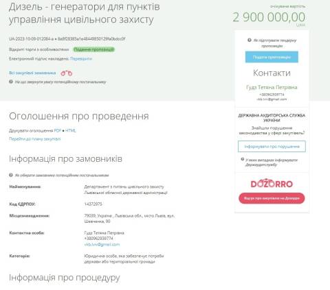 Департамент з питань цивільного захисту Львівської ОВА оголосив тендер у системі ProZorro на придбання дизельних генераторів для пунктів управління цивільного захисту, які переможець тендеру має поставити до 10 листопада 2023 року.