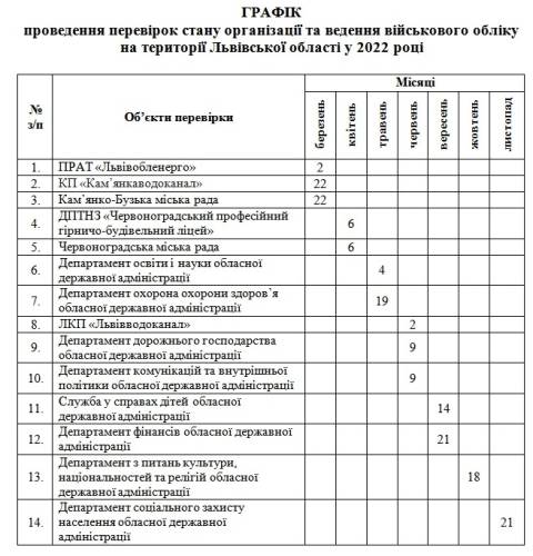 "З метою якісної організації та ведення військового обліку на території Львівської області у 2022 році затвердити аналіз стану організації та ведення військового обліку на території Львівської області у 2021 році, затвердити склад обласної комісії з перевірки стану організації та ведення військового обліку на території Львівської області, графік проведення перевірок, заходи щодо організації та покращення стану військового обліку на території Львівської області у 2022 році" – йдеться у розпорядженні.