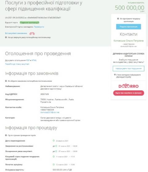Департамент освіти і науки Львівської обласної державної адміністрації оголосив закупівлю у системі ProZorro на послуги з професійної підготовки у сфері підвищення кваліфікації, які переможець тендеру має доставити до 20 грудня 2021 року.