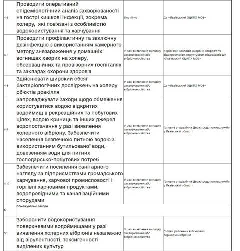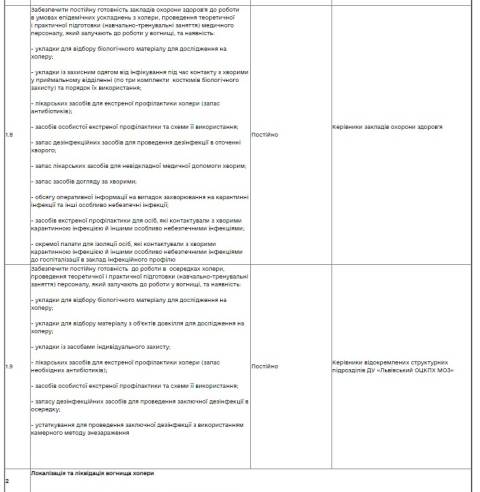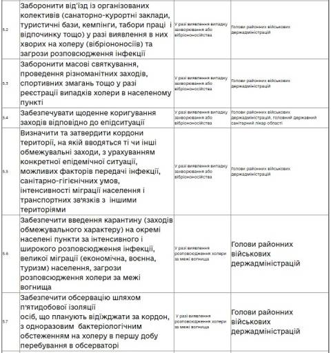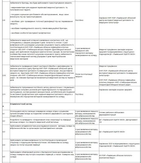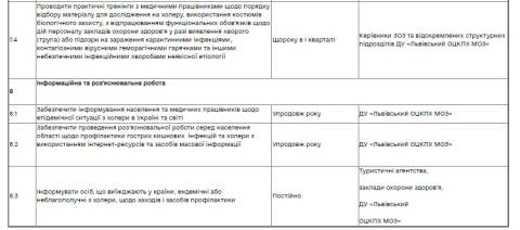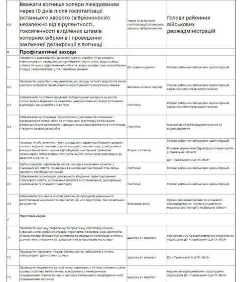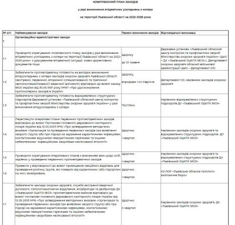 "Затвердити Комплексний план заходів у разі виникнення епідемічних ускладнень з холери на території Львівської області на 2022-2026 роки. Департаменту охорони здоров'я обласної військової адміністрації, ДУ "Львівський обласний центр контролю та профілактики хвороб МОЗ України", ГУ Держпродспоживслужби у Львівській області, головам районних військових адміністрацій забезпечити в межах компетенції виконання плану" – йдеться у розпорядженні.