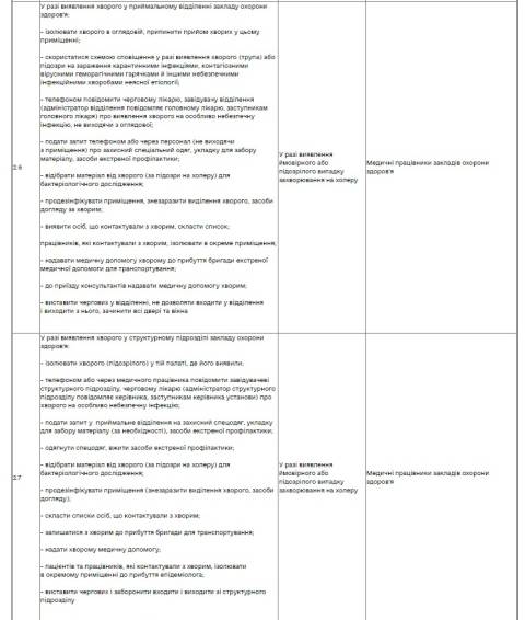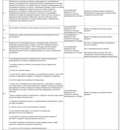 Згідно з документом, у разі виявлення ймовірного або підозрілого випадку захворювання на холеру, хворого необхідно госпіталізувати до таких закладів: КНП ЛОР "Львівська обласна інфекційна клінічна лікарня", КНП "Стебницька міська лікарня" або КНП ЛОР "Львівський обласний центр екстреної медичної допомоги та медицини катастроф".