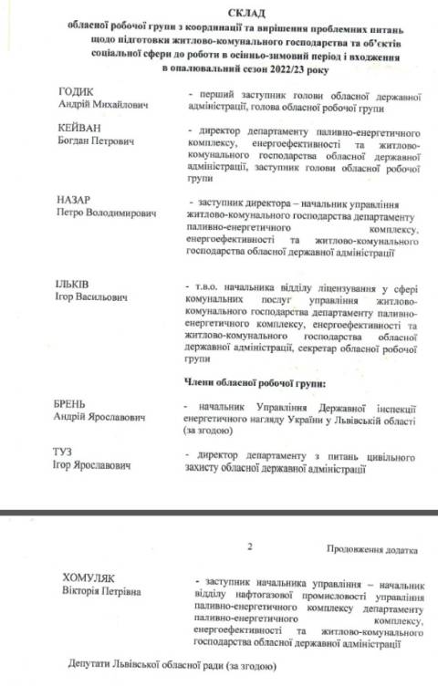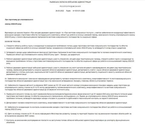 "З метою забезпечення координації ефективного виконання заходів з підготовки об'єктів господарського комплексу області до роботи в осінньо-зимовий період, своєчасного початку опалювального сезону 2022/23 року і сталого функціонування підприємств житлово-комунального господарства та соціальної сфери зобов'язую створити обласну робочу групу з координації та розв'язання проблемних питань щодо підготовки житлово-комунального господарства та об'єктів соціальної сфери до роботи в осінньо-зимовий період і входження в опалювальний сезон 2022/23 року та затвердити її склад" – йдеться у розпорядженні.