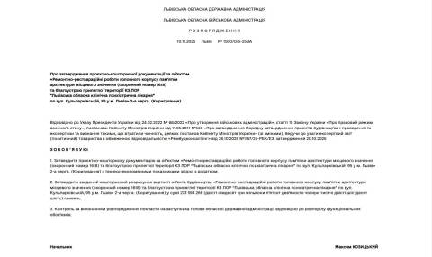 Максим Козицький затвердив проєктно-кошторисну документацію з другої черги ремонтно-реставраційних робіт головного корпусу пам’ятки архітектури місцевого значення та благоустрою прилеглої території КЗ ЛОР "Львівська обласна клінічна психіатрична лікарня", що на вул. Кульпарківській, 95 у Львові, враховуючи експертний звіт ТОВ "Рембудконсалтінг" від 28 жовтня 2025 року.