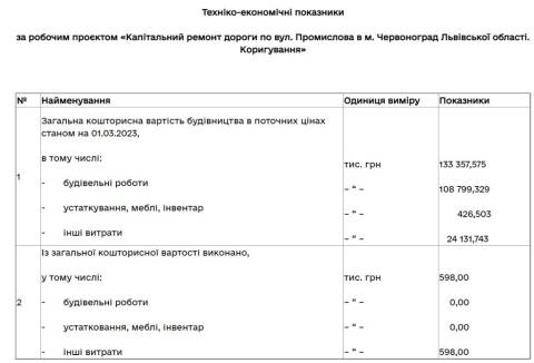 Згідно із проєктом, загальна вартість усіх робіт з ремонту вул. Промислової становитиме 133 357 575 грн й складатиметься із таких витрат: