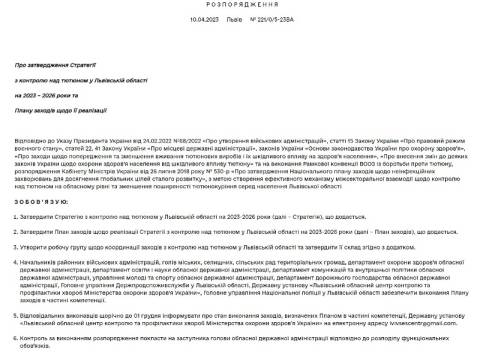 "З метою створення ефективного механізму міжсекторальної взаємодії щодо контролю над тютюном на обласному рівні та зменшення поширеності тютюнокуріння серед населення Львівської області зобов'язую затвердити Стратегію з контролю над тютюном у Львівській області на 2023-2026 роки. Затвердити План заходів щодо реалізації Стратегії з контролю над тютюном у Львівській області на 2023-2026 роки" – йдеться у розпорядженні.