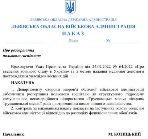 "Департаменту охорони здоров’я обласної військової адміністрації забезпечити розгортання польового госпіталю як структурного підрозділу комунального некомерційного підприємства "Трускавецька міська лікарня" Трускавецької міської ради з дотриманням вимог чинного законодавства" – йдеться у розпорядженні.