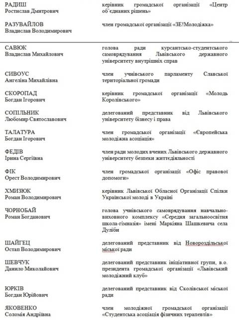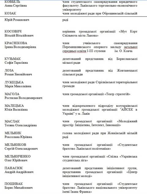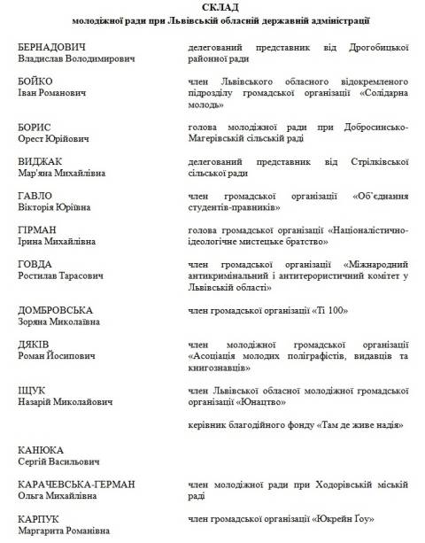"Утворити молодіжну раду при Львівській обласній державній адміністрації та затвердити її склад. Затвердити положення про молодіжну раду при Львівській обласній державній адміністрації" – йдеться у розпорядженні.