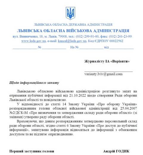 Львівська обласна військова адміністрація відмовилася надати інформацію про створення Ради оборони Львівської області та копію офіційного документа, на підставі якого її створили.