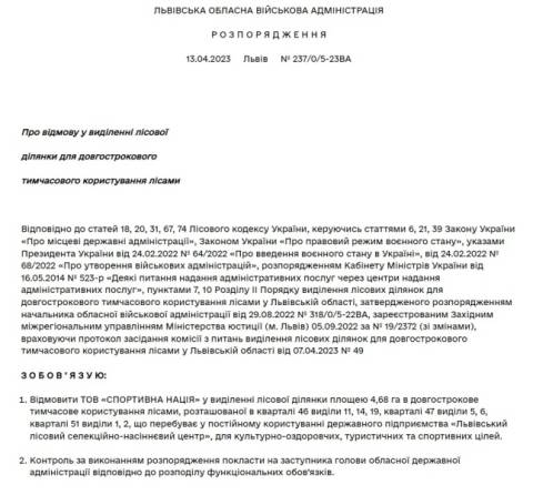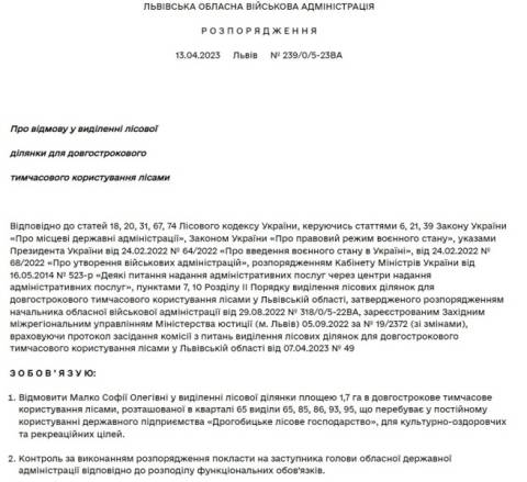 Причиною відмови Софії Малко та ТОВ "Спортивна нація" є протокол засідання комісії з питань виділення лісових ділянок для довгострокового тимчасового користування лісами у Львівській області від 7 квітня цього року.