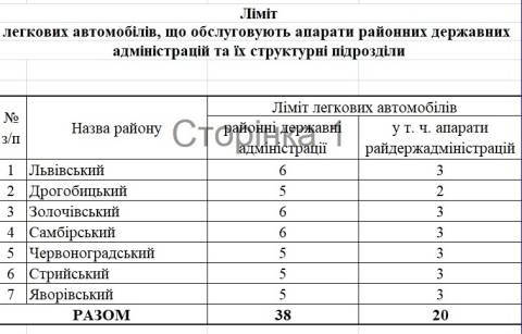 Натомість ліміт легкових автомобілів, що обслуговують апарати районних державних адміністрацій та їх структурні підрозділи, становить 38 одиниць.