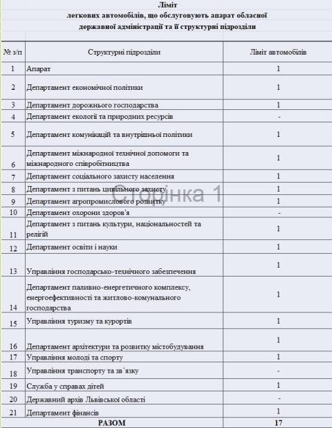 Згідно із розпорядженням, граничний ліміт клькості легковиків для Львівської ОДА становить 17 одиниць.