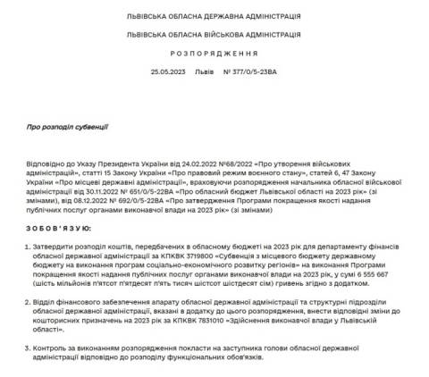 Про це йдеться у розпорядженні начальника Львівської ОВА Максима Козицького № 377/0/5-23ВА від 25 травня 2023 року.