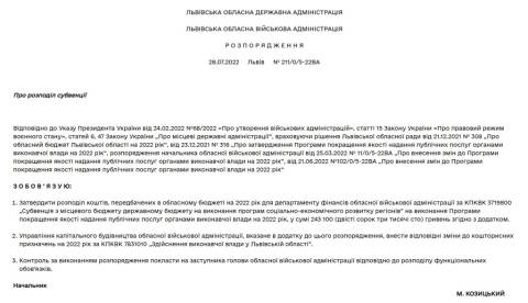 Про це йдеться у розпорядженні голови Львівської ОВА Максима Козицького № 211/0/5-22ВА від 28 липня 2022 року.