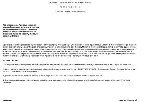 Про це йдеться у розпорядженні начальника Львівської ОВА Максима Козицького від 22 вересня 2025 року.