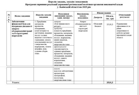 "Основне завдання Програми – мотивація кваліфікованого кадрового потенціалу для досягнення конкретних результатів. Важливим чинником є забезпечення належного поточного утримання апарату і структурних підрозділів обласної державної адміністрації (оплата послуг з легалізації та супроводу бухгалтерських і комп’ютерних програм, обслуговування технічних засобів інформаційно-аналітичних систем, видатків за оренду приміщень, комунальних послуг та енергоносіїв, відряджень, придбання господарських і канцелярських товарів тощо)" – вказано у документі.