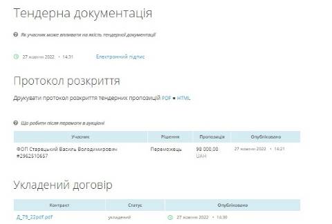 Аукціон відбувся 27 жовтня, на нього зголосився лише один учасник, якого й оголосили переможцем – підприємець Василь Старецький, що погодився виготовити для Львівської ОВА промоційні відеоролики за встановлену ціну у 98 000 грн.