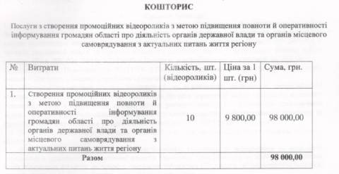 Як вказано у закупівлі, переможець тендеру має виготовити 10 відеороликів про діяльність органів державної влади та органів місцевого самоврядування. Вартість одного відеоролика становить 9 800 грн, а термін підготовки сюжетів – не більше 48 годин.