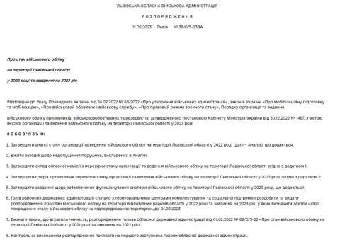 "З метою якісної організації та ведення військового обліку на території Львівської області у 2023 році зобов'язую затвердити аналіз стану організації та ведення військового обліку на території Львівської області у 2022 році, затвердити графік проведення перевірок стану організації та ведення військового обліку на території Львівської області у 2023 році, затвердити завдання щодо забезпечення функціонування системи військового обліку на території Львівської області у 2023 році" – йдеться у розпорядженні.