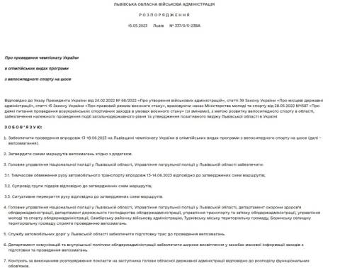 "З метою розвитку велосипедного спорту в області, забезпечення належного проведення події загальнодержавного рівня та утвердження позитивного іміджу Львівської області в Україні зобов'язую забезпечити проведення впродовж 13-18.06.2023 на Львівщині чемпіонату України в олімпійських видах програми з велосипедного спорту на шосе" – йдеться у розпорядженні.