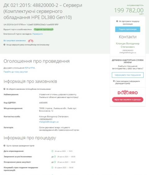 Управління з питань цифрового розвитку Львівської ОВА оголосило тендер у системі ProZorro з придбання серверів (комплектуючі серверного обладнання HPE DL380 Gen10), яку переможець тендеру має поставити до 17 липня 2023 року.