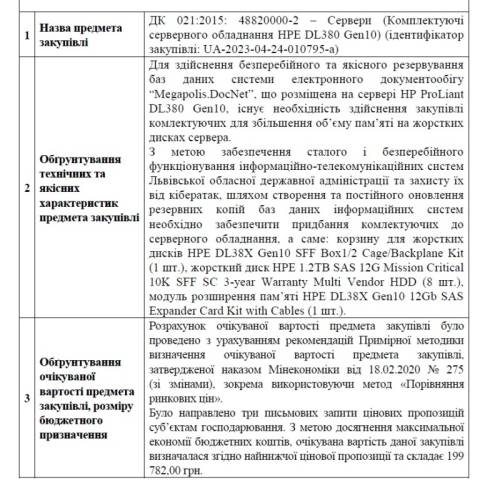 Згідно з закупівлею, Львівська ОВА, для здійснення безперебійного та якісного резервування баз даних системи електронного документообігу Megapolis.DocNet, планує замовити комплектуючі для збільшення обсягу пам'яті на жорстких дисках сервера.