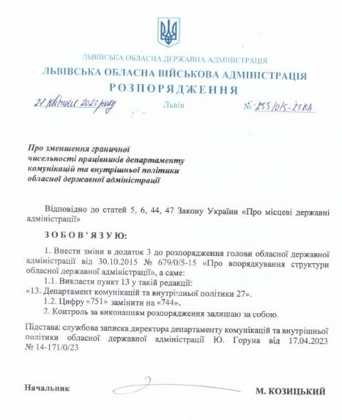 Максим Козицьким своїм розпорядженням зменшив граничну кількість працівників у департаменті комунікацій та внутрішньої політики Львівської ОВА.