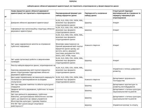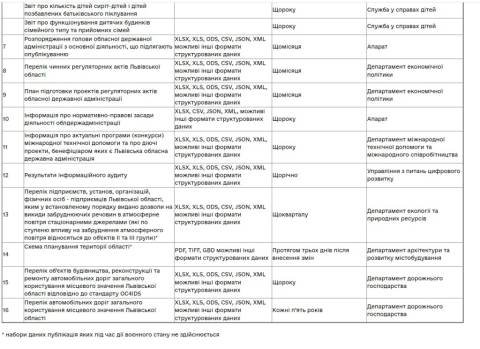 - перелік наборів даних Львівської ОВА, які підлягають оприлюдненню у формі відкритих даних;