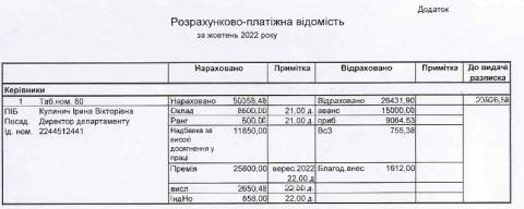 Додамо, у лютому 2022 року Кулинич отримала 110 тис. грн зарплати, у травні – 49 тис. грн, у червні – 54 тис. грн, у липні – 43 тис. грн, у серпні – 57 тис. грн, у вересні – 44 тис. грн.