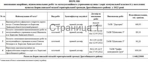 - перелік виконання аварійних, відновлювальних робіт та експлуатаційного утримання вулиць і доріг комунальної власності у населених пунктах Бориславської міської територіальної громади Дрогобицького району у 2022 році;