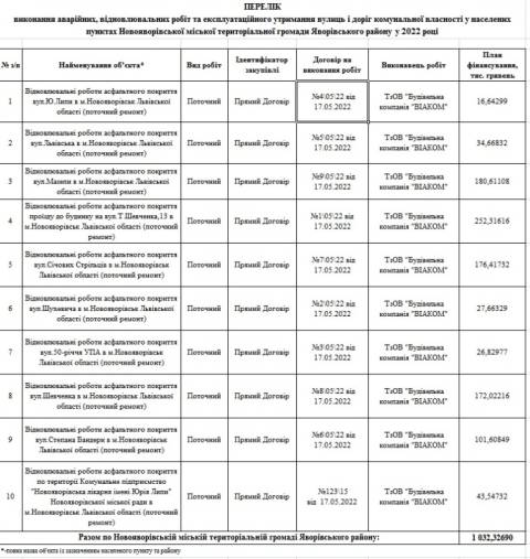- перелік виконання аварійних, відновлювальних робіт та експлуатаційного утримання вулиць і доріг комунальної власності у населених пунктах Новояворівської міської територіальної громади Яворівського району у 2022 році;