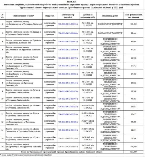 - перелік виконання аварійних, відновлювальних робіт та експлуатаційного утримання вулиць і доріг комунальної власності у населених пунктах Трускавецької міської територіальної громади Дрогобицького району Львівської області у 2022 році" – йдеться у розпорядженні.