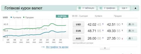 Сьогодні, 1 грудня, середній готівковий курс долара становить 42,51 гривні у продажу та 42,02 гривні в купівлі, а євро – 49,33 гривні у продажу та 48,71 гривні у купівлі.