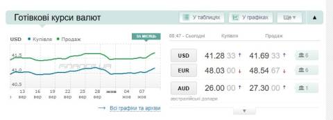 Сьогодні, 10 жовтня, середній готівковий курс долара становить 41,69 гривні у продажу та 41,28 гривні в купівлі, а євро – 48,54 гривні у продажу та 48,03 гривні у купівлі.