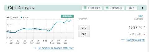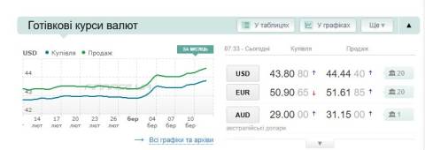 Сьогодні, 12 березня, середній готівковий курс долара становить 44,44 гривні у продажу та 43,80 гривні в купівлі, а євро – 51,61 гривні у продажу та 50,90 гривні у купівлі.