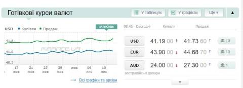 Сьогодні, 13 листопада, середній готівковий курс долара становить 41,73 гривні у продажу та 41,19 гривні в купівлі, а євро – 44,68 гривні у продажу та 43,90 гривні у купівлі.