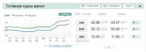 Сьогодні, 13 січня, середній готівковий курс долара становить 43,57 гривні у продажу та 42,96 гривні в купівлі, а євро – 50,90 гривні у продажу та 50,12 гривні у купівлі.