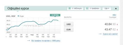 Сьогодні, 17 червня, середній готівковий курс долара становить 41,05 гривні у продажу та 40,53 гривні в купівлі, а євро – 44,32 гривні у продажу та 43,55 гривні у купівлі.