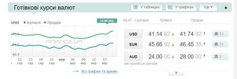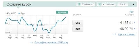 Сьогодні, 17 вересня, середній готівковий курс долара становить 41,74 гривні у продажу та 41,14 гривні в купівлі, а євро – 46,45 гривні у продажу та 45,66 гривні у купівлі.