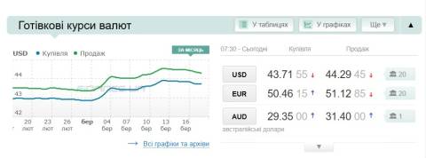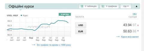 Сьогодні, 18 березня, середній готівковий курс долара становить 44,29 гривні у продажу та 43,71 гривні в купівлі, а євро – 51,12 гривні у продажу та 50,46 гривні у купівлі.