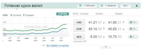 Сьогодні, 19 липня, середній готівковий курс долара становить 41,90 гривні у продажу та 41,21 гривні в купівлі, а євро – 45,83 гривні у продажу та 45,10 гривні у купівлі.