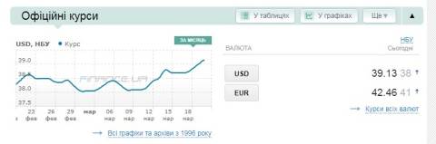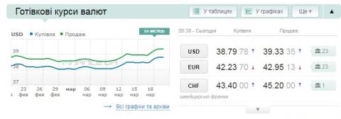 Сьогодні, 20 березня, середній готівковий курс долара становить 39,33 гривні у продажу та 38,79 гривні в купівлі, а євро – 42,95 гривні у продажу та 42,23 гривні у купівлі.