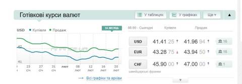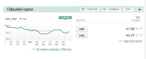 Сьогодні, 20 лютого, середній готівковий курс долара становить 41,96 гривні у продажу та 41,41 гривні в купівлі, а євро – 43,94 гривні у продажу та 43,28 гривні у купівлі.