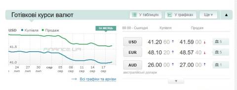 Сьогодні, 20 серпня, середній готівковий курс долара становить 41,59 гривні у продажу та 41,20 гривні в купівлі, а євро – 48,57 гривні у продажу та 48,10 гривні у купівлі.
