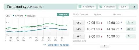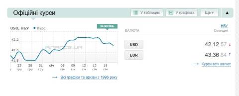 Сьогодні, 20 січня, середній готівковий курс долара становить 42,68 гривні у продажу та 42,05 гривні в купівлі, а євро – 44,14 гривні у продажу та 43,31 гривні у купівлі.